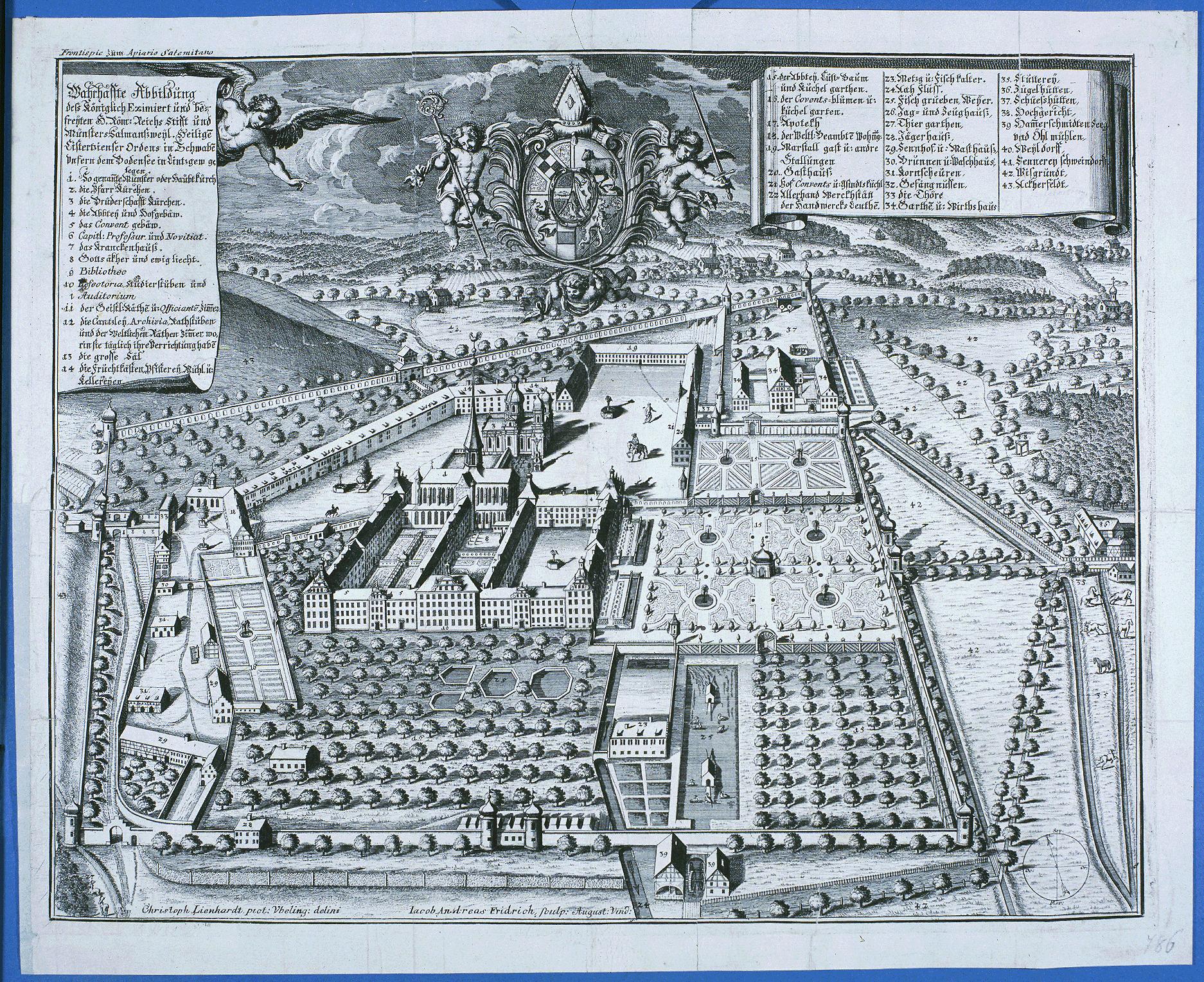 Prospekt der Zisterzienserabtei Salem. Kupferstich (Ausschnitt) v. J. Fridrich nach Chr. Lienhardt, 1708.