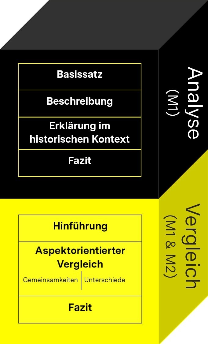 Visualisierung der Textprozedur einer Analyse und eines Vergleichs in Form eines Quaders.