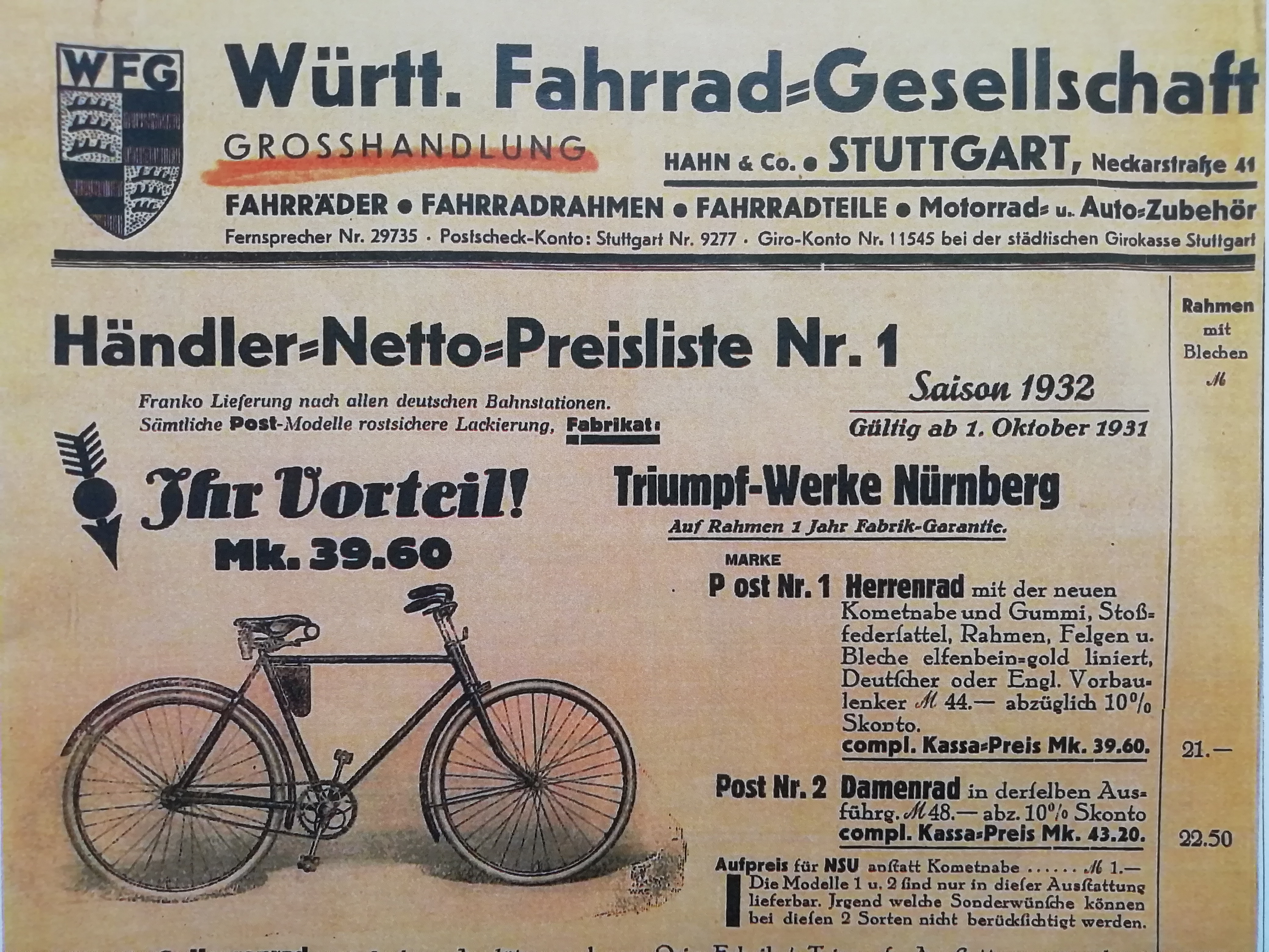 B 21 Württembergische Fahrradgesellschaft (Hahn), Preisliste 1931 StAL FL 300/31 I, Bü 1551 © Stadtarchiv Backnang (Jahrbuch Backnang 2020, H.-J. Gerste)