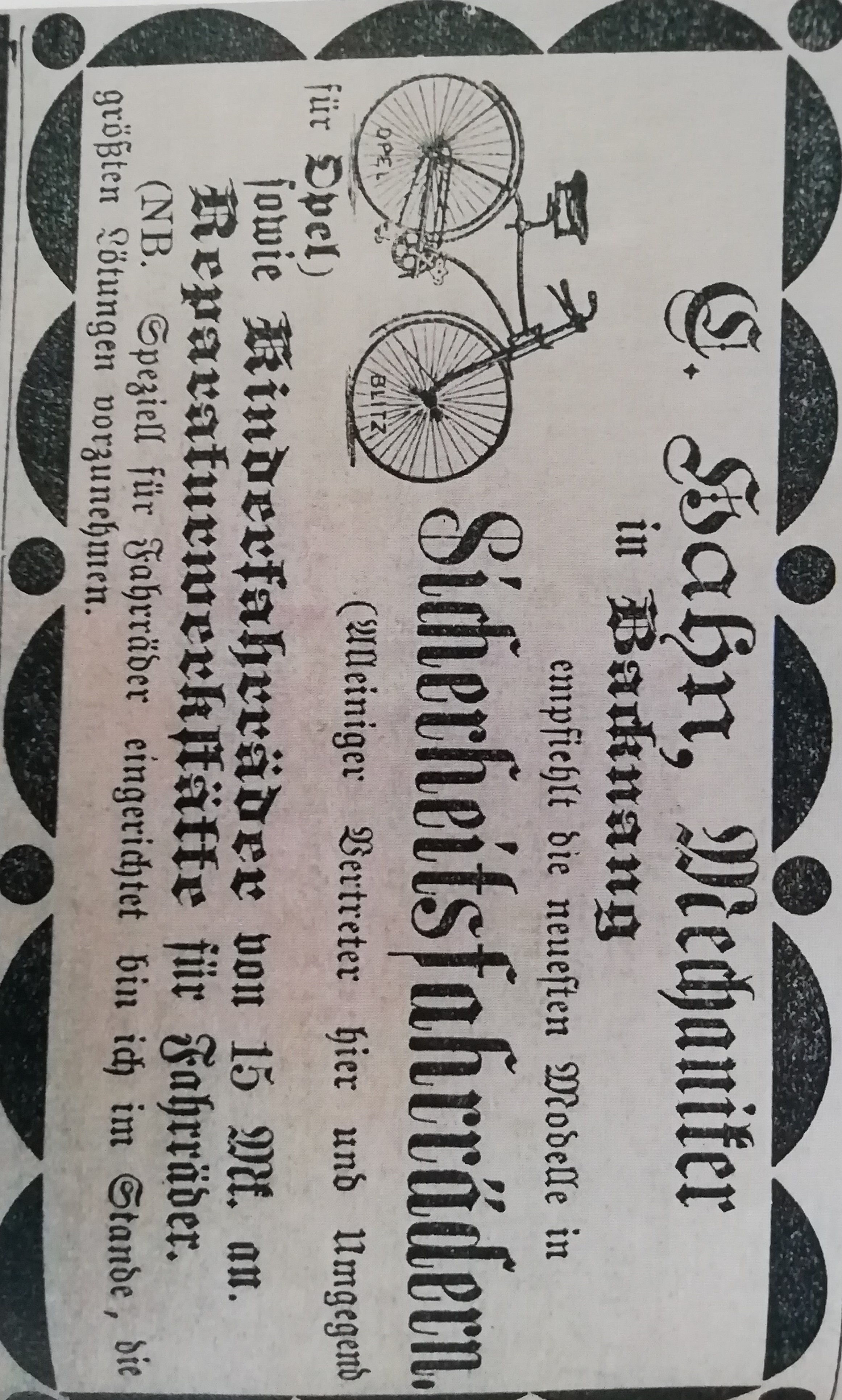 B 5 Erste Fahrradwerbung Mechaniker Hahn 1890, Murrtalbote 29.3.1890 © Stadtarchiv Backnang (Jahrbuch Backnang 2020, H.-J. Gerste)