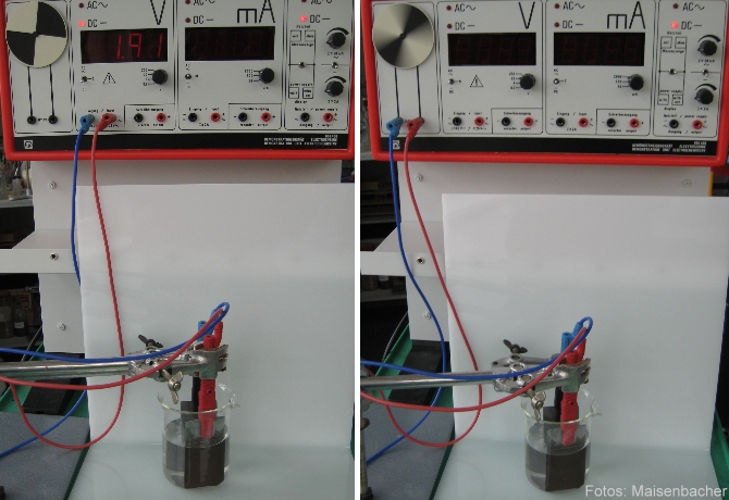 Stromentnahme Im linken Bild wird die Spannung nach dem Aufladen gemessen. Bild rechts: Ein kleiner Elektromotor wird mit dem "Blei-Akku" betrieben. Zeige Bild in voller Größe…