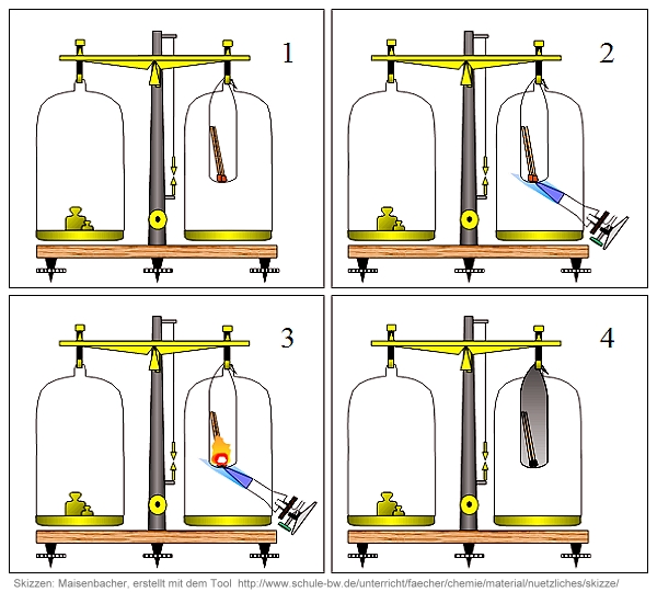 Skizzen zum Versuchsverlauf: Massenerhaltung demonstriert mit einer Balkenwaage