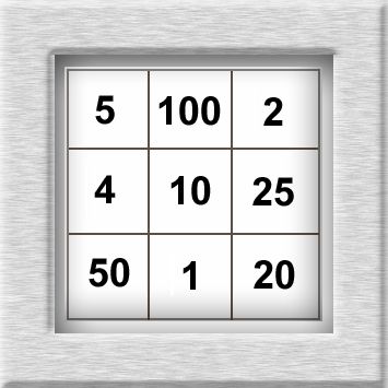 Beispielaufgabe. Ein ausgefülltes malmagisches Quadrat mit dem magischen Produkt 1000. Erste Zeile 5, 100, 2; zweite Zeile 4, 10, 25; dritte Zeile 50, 1, 20.