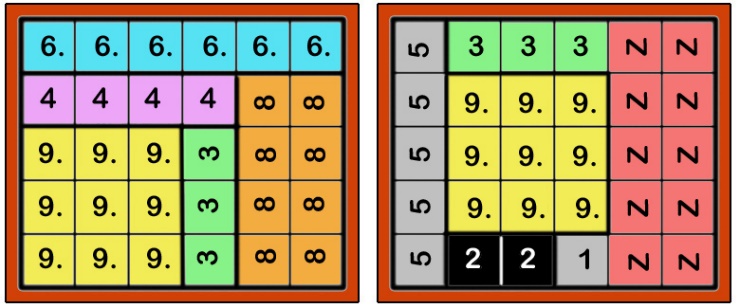 Abgebildet ist jeweils eine mögliche Lösung. Verwendet wurde für die 5 Teile das Dreier-Rechteck, das Vierer-Rechteck, das Sechser-Rechteck der Länge 6, das Achter-Rechteck und natürlich das vorgegebene Neuner-Quadrat. Kurz: "9 + 8 + 6 + 4 + 3".