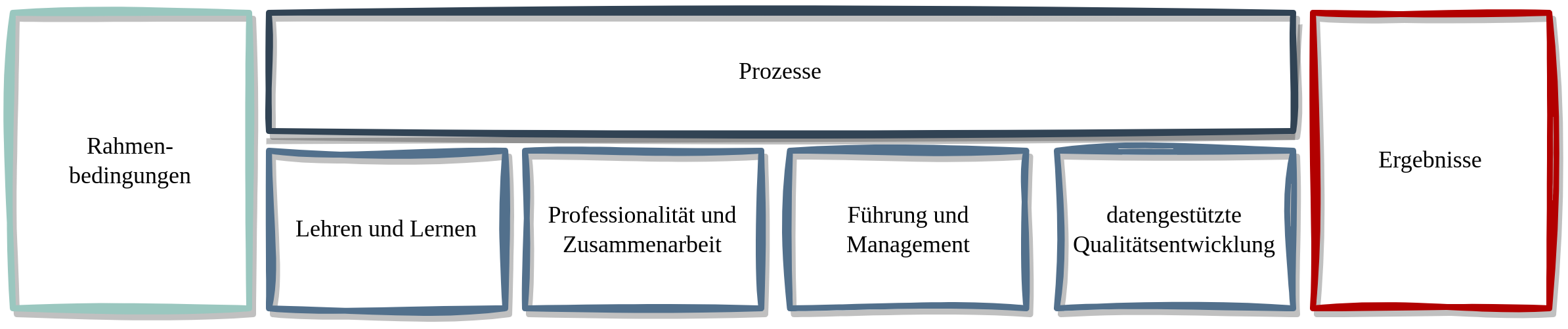 Der Referenzrahmen gliedert sich in drei große Felder: 1 Rahmenbedingungen, 2 Prozesse, 3 Ergebnisse . Dabei ist der Bereich "Prozesse" in 4 Qualitätsbereiche weiter untergliedert: 1 Lehren und Lernen, 2 Professionalität und Zusammenarbeit, 3 Führung und Management sowie 4 datengestützte Qualitätsentwicklung.